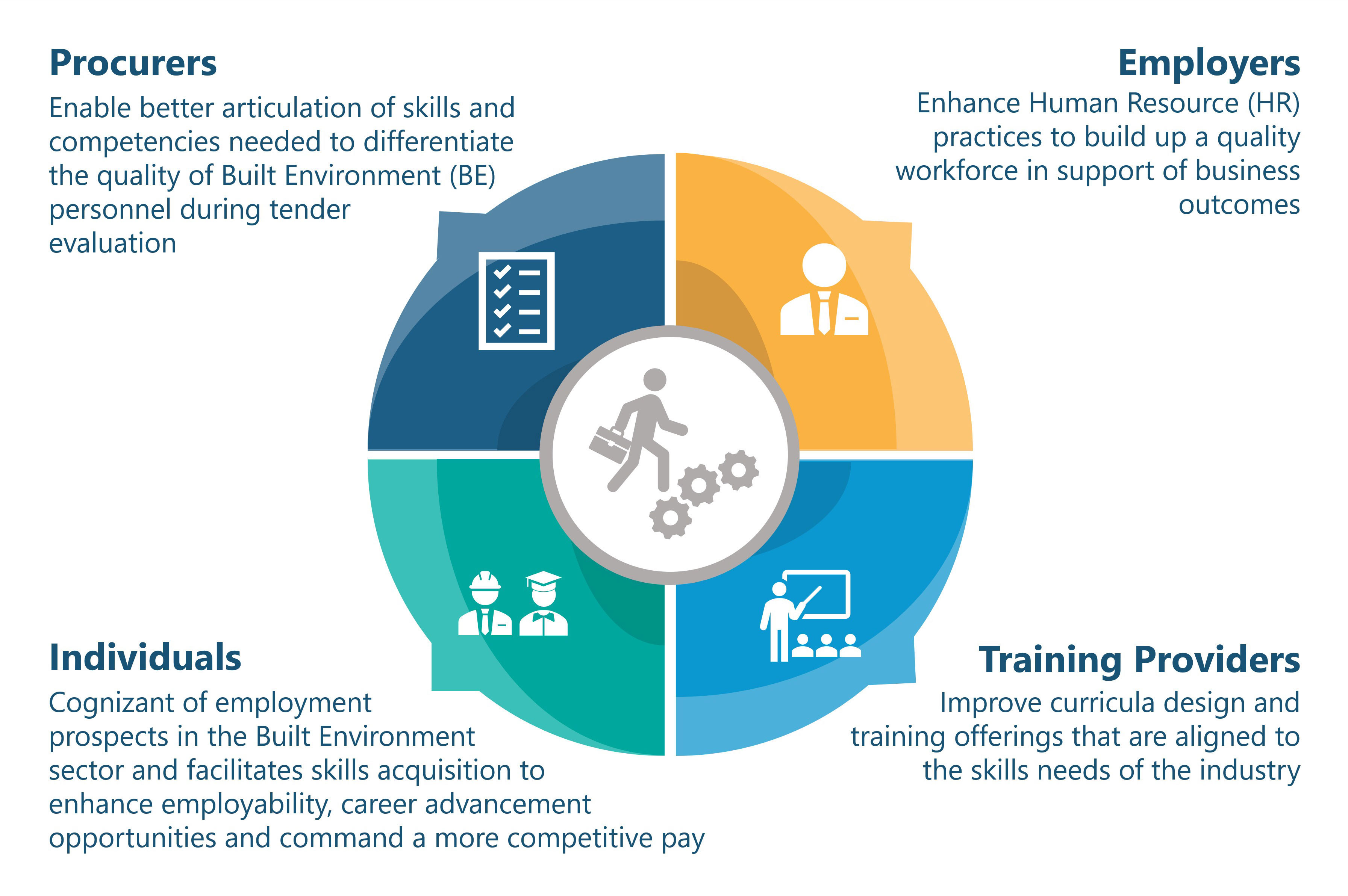 The Skills Framework for Built Environment is developed by BCA, SkillsFuture Singapore, and Workforce Singapore, together with employers, unions, and training providers. It provides a common skills language to understand job roles, career paths, and skills requirements, enabling a unified approach to hiring, training, accreditation, and career planning across the BE sector.